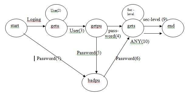 As an example, illustrating the use of network formalism, we implement in the following diagram the state-transition of a LOGIN command. The notation follows widely used conventions. Each state is represented by a circle. Each transition between two states is depicted as a directed arc. It is labeled with the name of an input token, plus a footnote containing Boolean conditions, system responses and actions. A given state transition will occur if the input token is received and the conditions are satisfied; when the transition occurs, the system displays the response and performs the action.