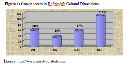 Institutional emphasis on collectivism versus individualism: This dimension reflects the degree to which individuals are encouraged by societal institutions to be integrated into groups within organisations and the society. Opposing to that, the Greek society emphasises strongly on individualism and tend to value autonomy and individual freedom. Rewards are based on individual performance because self interest is more strongly valued than the collective group. This dimension indicates the societal transformation that occurred since the early 1980s when Hofstede (1980) has found Greece to score very low in the individualism-collectivism index.