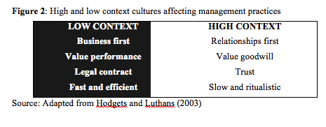 Greek managers are also influenced from the country’s high context culture (Figure 2). Context is defined here in terms of how individuals and their society seek information (Hall & Hall, 1990). People from high context cultures obtain information from personal information networks. Before such people make a decision, or arrange a deal they have become well informed about the facts associated with it. They have discussed the matter with friends, colleagues or even family members. They will have asked questions and listen to rumours or gossip. On the other hand, people from low context cultures seek information about decisions and deals from a research database whilst they would also listen to the views of colleagues or relatives (Morden, 1999).