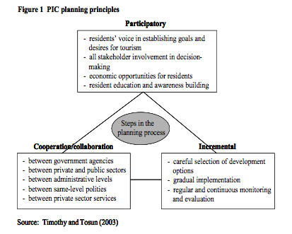 Timothy and Tosun (2003) present a normative model of destination community tourism planning that combines three broad strategies into one under the abbreviation ‘PIC’ (Planning, Incremental and Collaborative). On the basis of participatory, incremental and collaborative planning, this model, as illustrated in Figure 1, implies that a combination of strategies is a more sure technique in the planning process than a singular method or approach. Timothy and Tosun (2003) further argue that principles, such as equity, efficiency, integration, balance and ecological and cultural integrity, are more effectively brought about when community members are allowed and encouraged to participate in tourism planning and development, when collaboration and cooperation are allowed to occur, and when tourism is developed in an incremental fashion. However, this model is not meant to replace the traditions of procedural planning, for example, the step-by-step planning process. Instead, the PIC principles should function in the broader context within which the rational comprehensive planning steps take place.