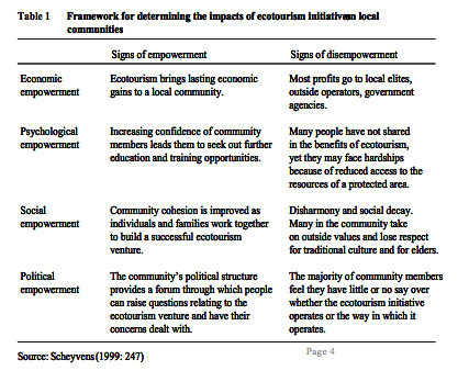 On the other hand, Lindberg et al. (1996), take an economic perspective when they examine ecotourism case studies form Belize. While they consider the extent to which ecotourism generates economic benefits for local communities, they do not account for how the amount of money entering communities is distributed, or how communities are affected socially and culturally by ecotourism ventures. Even when ecotourism results in economic benefits for a local community, it may result in damage to social and cultural systems, thus undermining people’s overall quality of life (Wilkinson and Pratiwi, 1995). Therefore, community-based approaches to ecotourism need to acknowledge the importance of social dimensions of the tourism experience, rather than primarily focusing on environmental or economic impacts (Scheyvens, 1999).