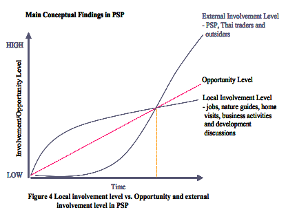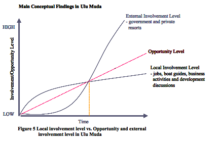 The degrees of local involvement in ecotourism in PSP and Ulu Muda are illustrated in Figures 4 and 5. The figure graphically summarises the findings of the study in a simplified fashion. The representation in Figures 4 and 5 does not represent exact measurement along the specified axes and no exact proportions should be attached to the diagrams. The illustration is only conceptual and is not intended to represent data that has been empirically proven.