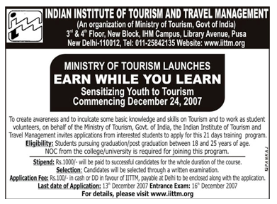 “Earn While You Learn-Sensitizing Youth to Tourism- A Training Programme”. This is a unique sub-scheme under the main CBSP Scheme, which IITTM have been entrusted with, to organize five programmes (full time) in a year, each of 21 days duration. As the name suggest, this is a programme for the students (college-going) and the first of its kind being introduced in the country. This programme was designed keeping in mind the number of trained personals that will be required for the numerous events that India is likely to host in the coming years, especially the forthcoming Commonwealth Games in 2010.