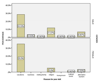 The age of visitors is determined in a range from 22 to 70 years, being the visitors of 50 years old, the ones that visit the most this place; from those, 54.84% are male and the rest females (see Graph 1).