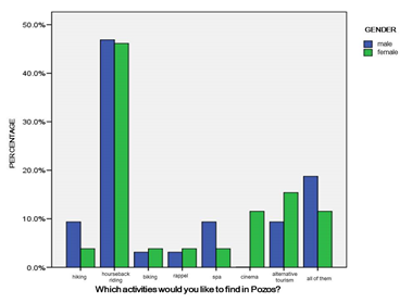 Finally, we define the interaction between the visitor and the destination considering the few options that he has to pass the time, for which the majority of respondents consider the walk (in terms of visiting the location without using a vehicle) as the main option to know the place. Other alternatives are to visit museums or restaurants. There is a high degree of discontent with the lack of activities for visitors, which some suggest several activities such as biking, horseback riding, spa, alternative tourism activities, classic cinema, etc. (see Graph 5)