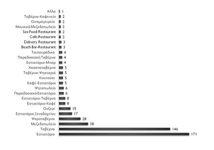 Tavern is divided into several categories. Fish-taverns offer fish dishes usually accompanied with alcohol drinks. Grill houses offer meat or chicken dishes accompanied or not with drinks. Souvlaki-taverns roast small pieces of meat in order to prepare the typical Greek souvlaki (Laloumis & Stefanakidis, 2005).