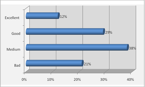 The participants’ evaluation about the level of quality of agrotourism in the prefectures of Kozani and Florina was recorded as follows: medium (38%), good (29%), bad (21%) and excellent (12%). Here is the relative graph: