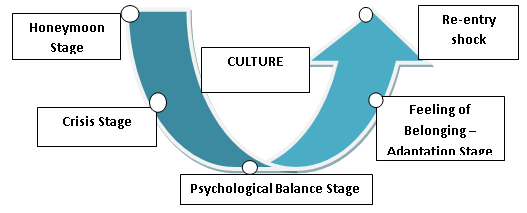 Culture shock can have different stages (Guanipa, 1998), that can be ongoing or might only appear at certain times. These different stages remind us the U-Curve of Culture Shock (Oberg, 1960) (see figure 1). At the first stage, the new arrival may feel euphoric and be pleased by all of the new things encountered. This time is called the "honeymoon" stage, as everything encountered is new and exciting. At this point we have to observe that conference participants usually stay on this first stage, due to their short time of stay.